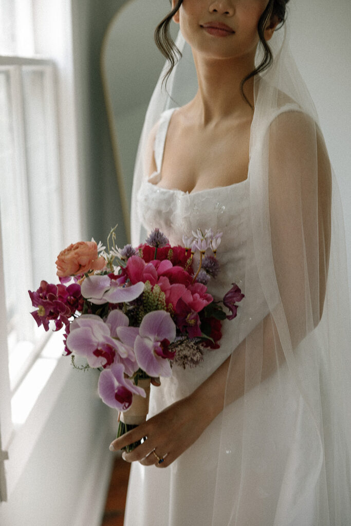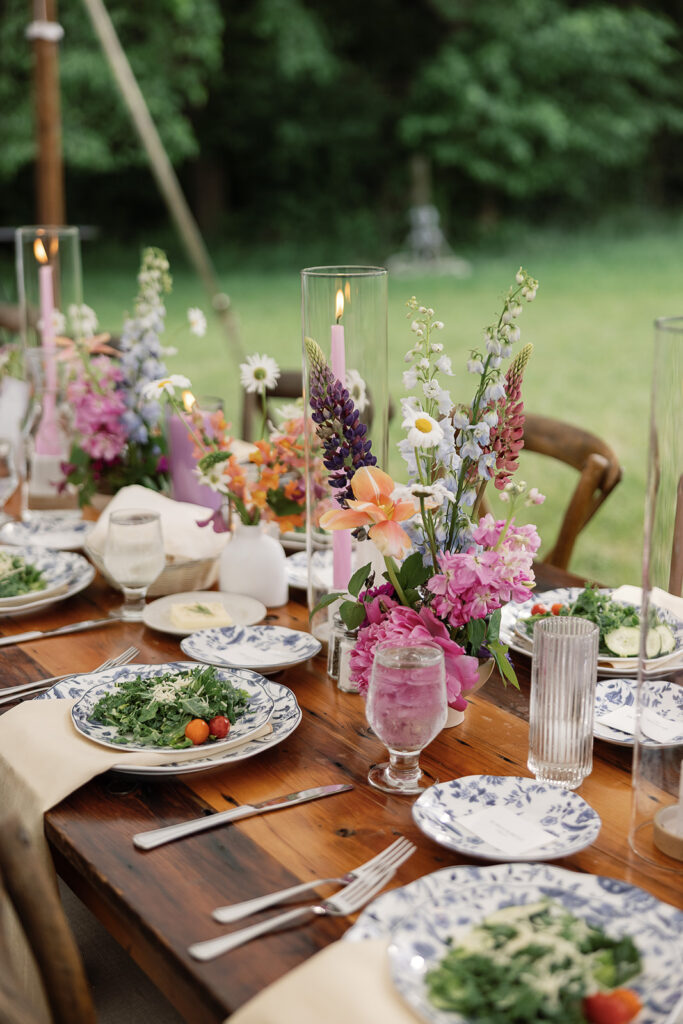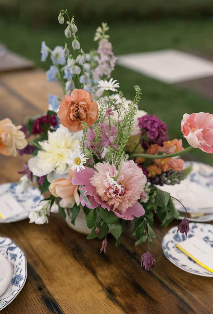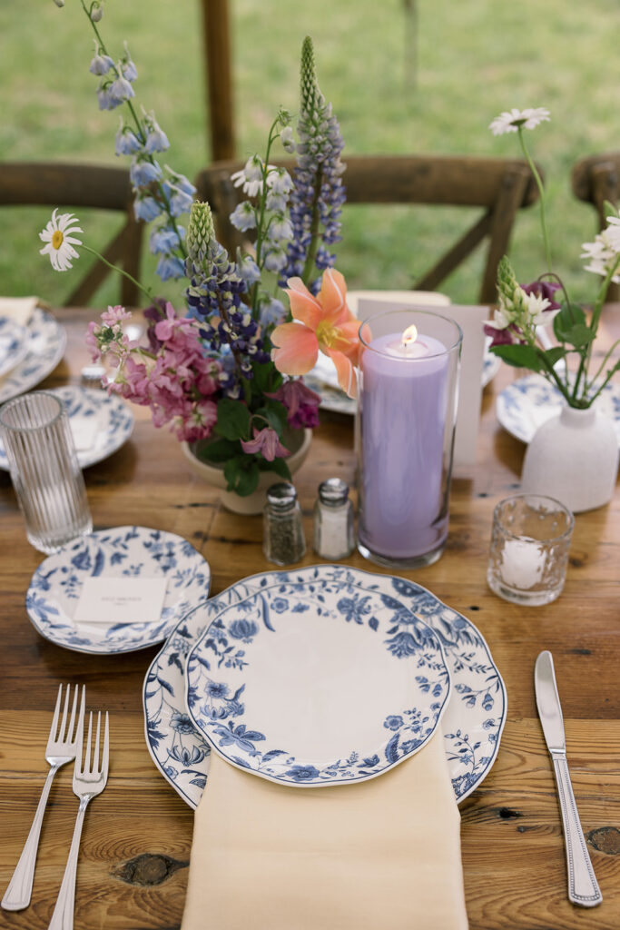 The color palette was blue, pink, and purple, vibrant, happy, and garden-inspired. We used blue floral patterned plates with farmhouse tables for an Italian-themed family-style dinner (Vicky is Vietnamese but was adopted into an Italian family, so this felt like the perfect nod to her story).