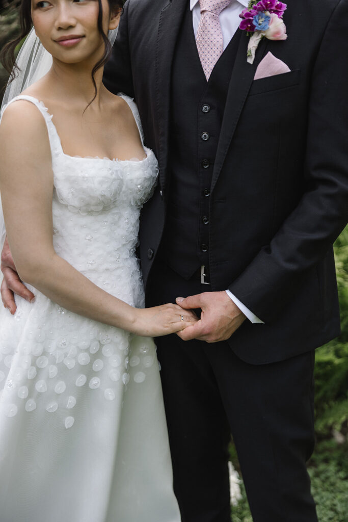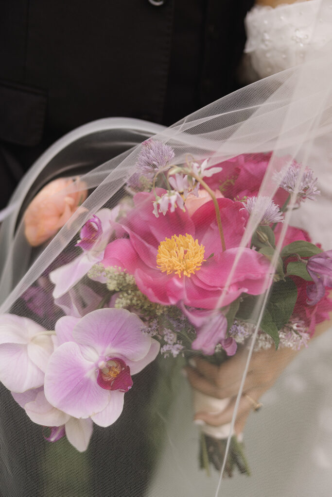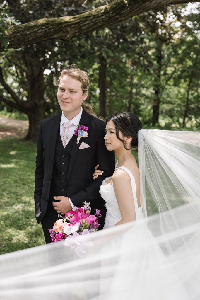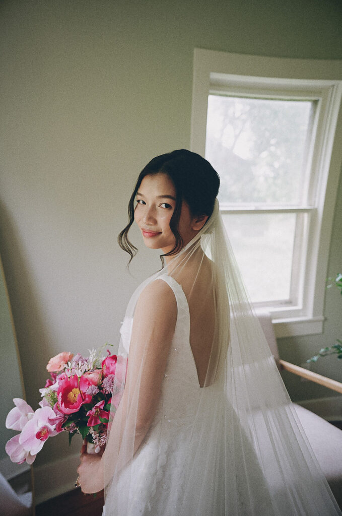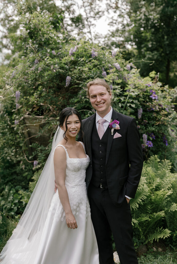 The color palette was blue, pink, and purple, vibrant, happy, and garden-inspired. We used blue floral patterned plates with farmhouse tables for an Italian-themed family-style dinner (Vicky is Vietnamese but was adopted into an Italian family, so this felt like the perfect nod to her story).