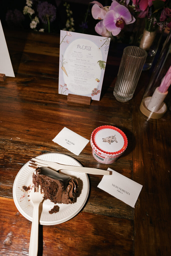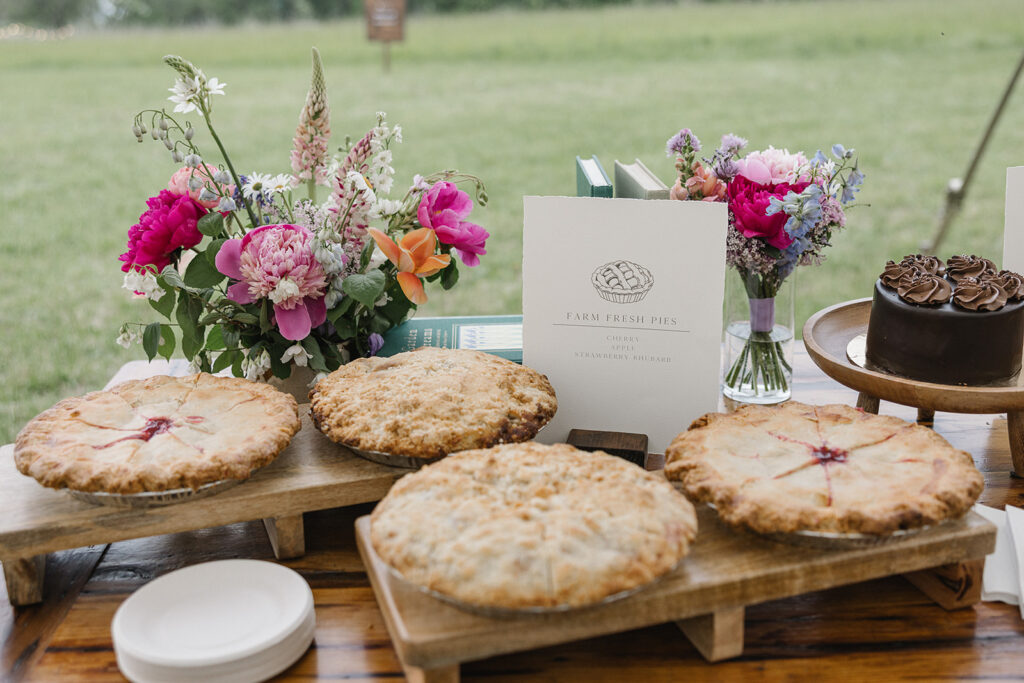 Lemon trees were placed throughout the space as a nod to the proposal. Al Dente Design Co. created an illustrated map of the property so guests could explore the farm. Vicky and Acaya knew they wanted to do pie, assorted desserts, and ice cream for their dessert, so we decided to add a cute touch with illustrated sticker labels of their farm animals and their farm for the ice cream lid tops.
