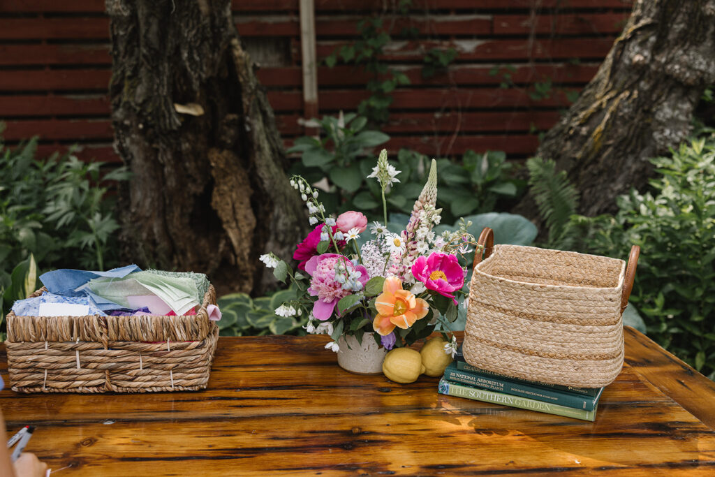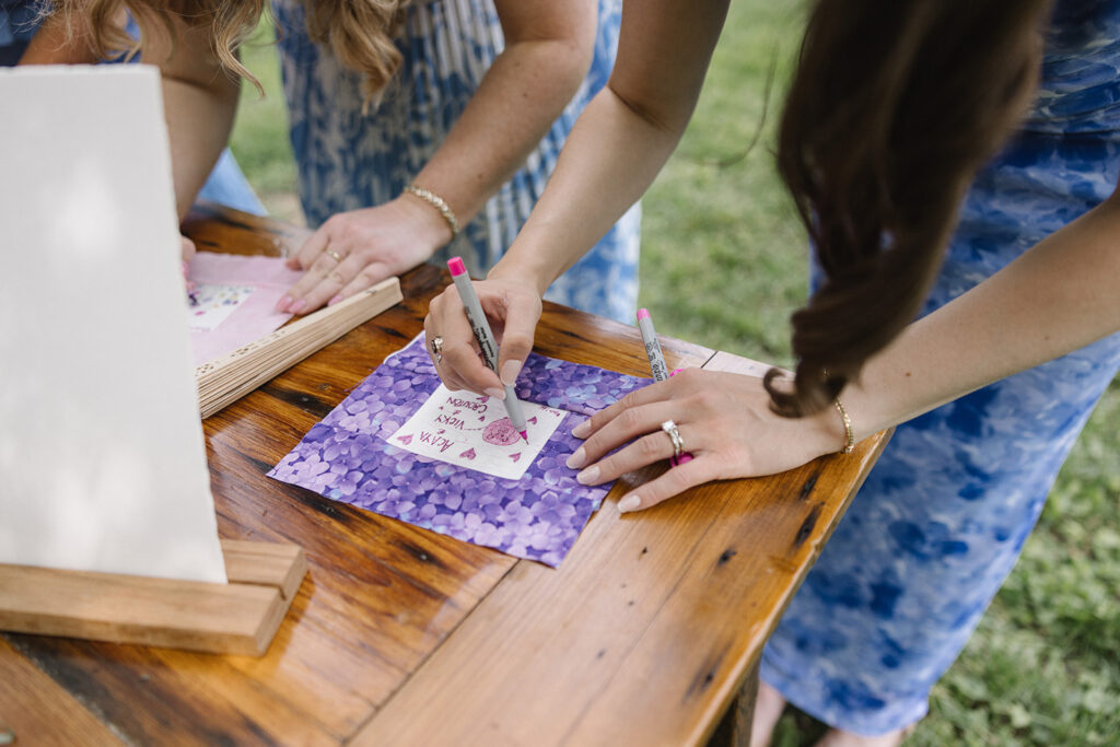 The guestbook table featured garden-themed books, with chinoiserie vases that matched the pattern of their plates A quilt patch guestbook where guests could write messages on fabric squares served as a meaningful keepsake that Vicky will turn into a quilt, and be something they’ll actually use in their farmhouse.